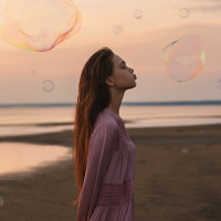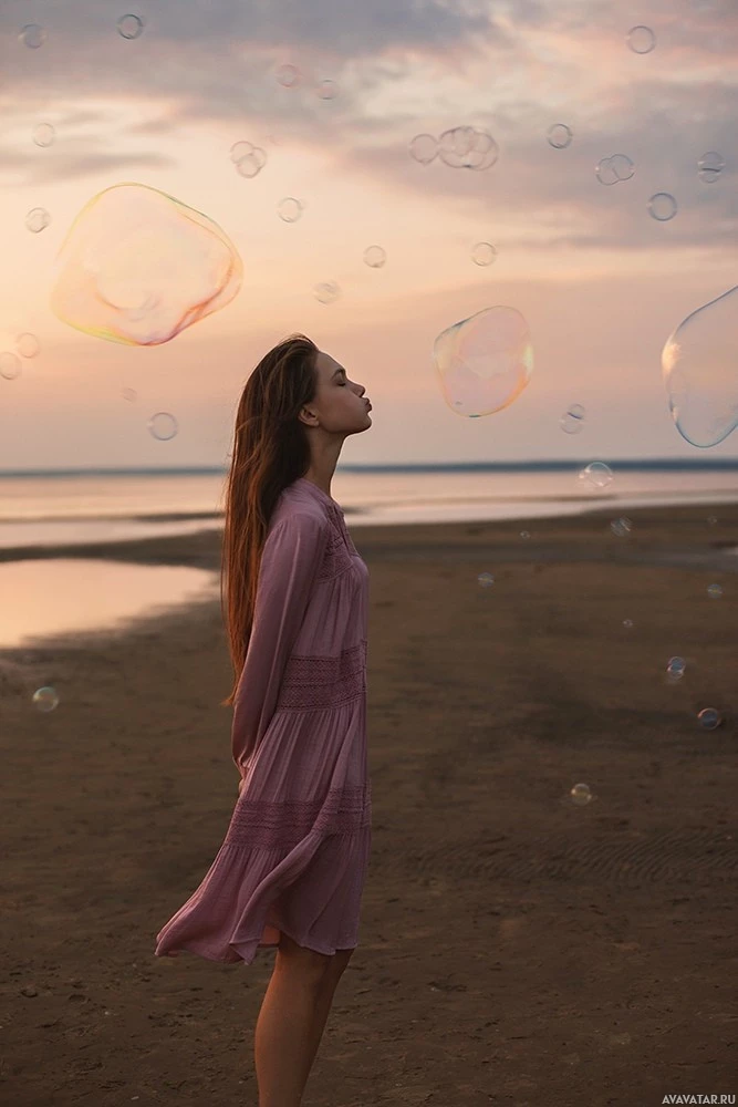 На картинке изображена женщина, стоящая на пляже на закате, учитывая теплые тона в небе. Она закрыла глаза и выдувает пузыри, которые плавают вокруг нее. На заднем плане изображен силуэт пейзажа с океанским горизонтом, видимым позади нее.