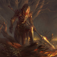a forested area after battle, with the ground strewn with debris and small fires burning nearby. The artwork is detailed, highlighting the character's posture and expression as if he is surveying the scene or waiting for his next move.