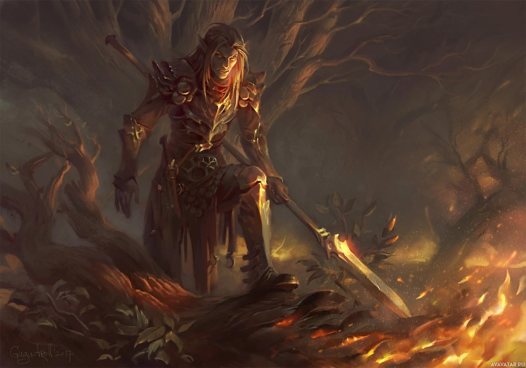 a fantasy scene featuring an elven warrior. This character is portrayed as a skilled fighter, armed with a lance and wearing armor that suggests a high level of