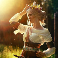 the video game "The Witcher 3: Wild Hunt." She appears to be cosplaying as the character, wearing a fantasy-style outfit with elements such as