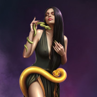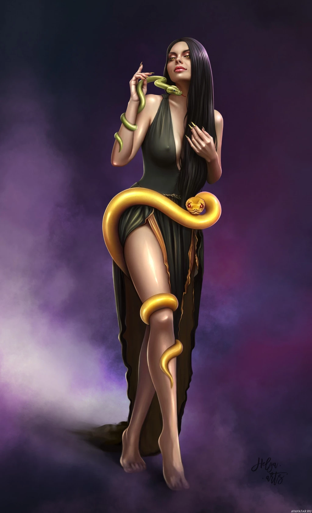 dark hair and is wearing a dress that seems to be adorned with snake motifs or possibly a costume meant to represent Medusa or another figure associated with snakes in mythology. The background features an ethereal, magical atmosphere, with mist or smoke giving the impression of