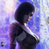 a dynamic pose with one hand raised as if she's holding or interacting with something not visible in the frame. Her attire appears to be a mix of futuristic elements and armor pieces, suggesting