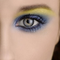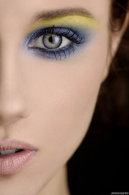 eye makeup, featuring blue and yellow hues that give the appearance of two different eyes. Her skin is fair, and she appears to have light, possibly