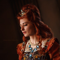Medieval attire, complete with an ornate headdress, jewelry, and clothing. This suggests that the individual may be participating in cosplay, which is the practice of dressing up as a character from a work of fiction, such as