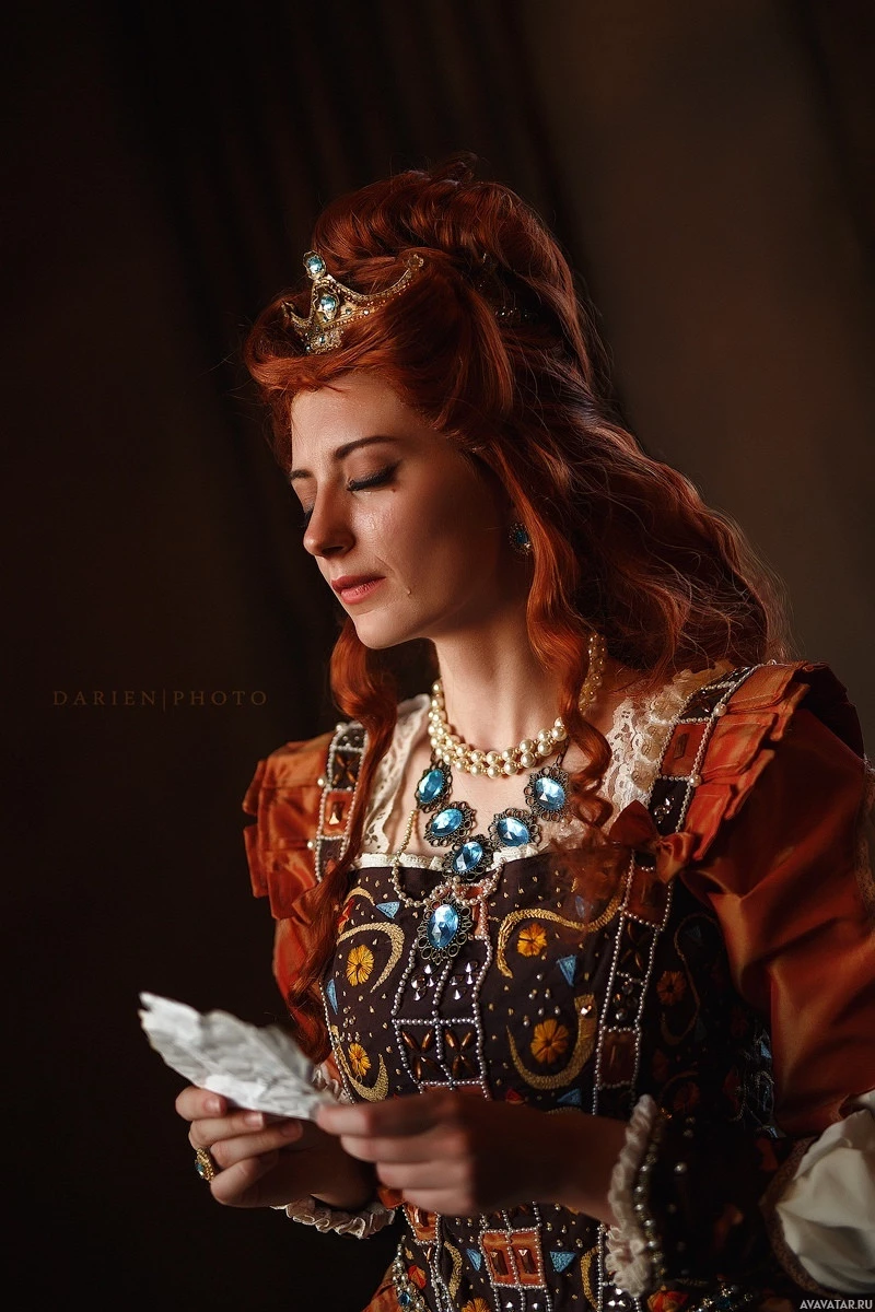 The image shows a person dressed in elaborate and detailed Renaissance or