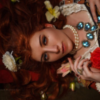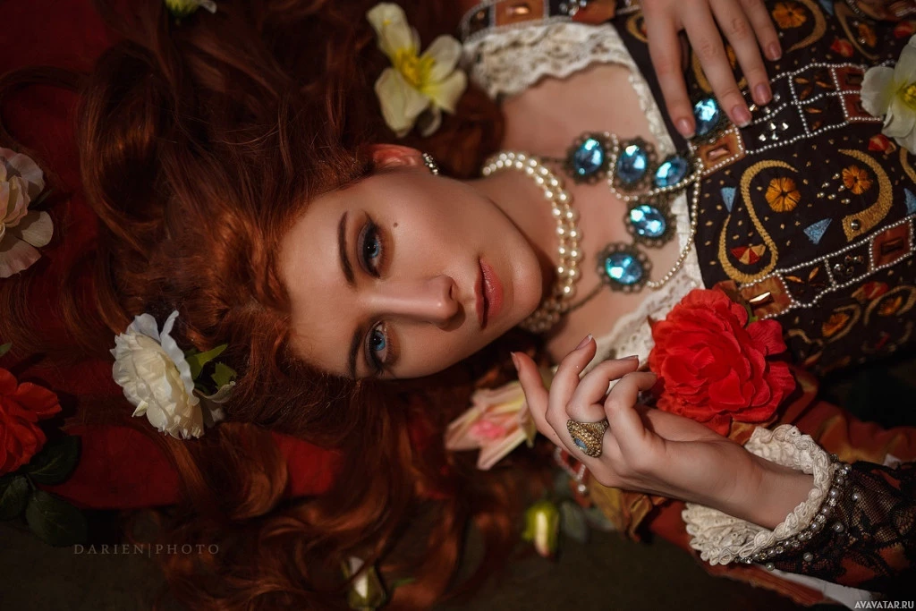 intricate makeup and accessories, suggesting they might be portraying a character from a game or cosplay event. The individual is surrounded by flowers that are red, white, and yellow in color, creating a vibrant and lush setting around them. The person has
