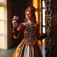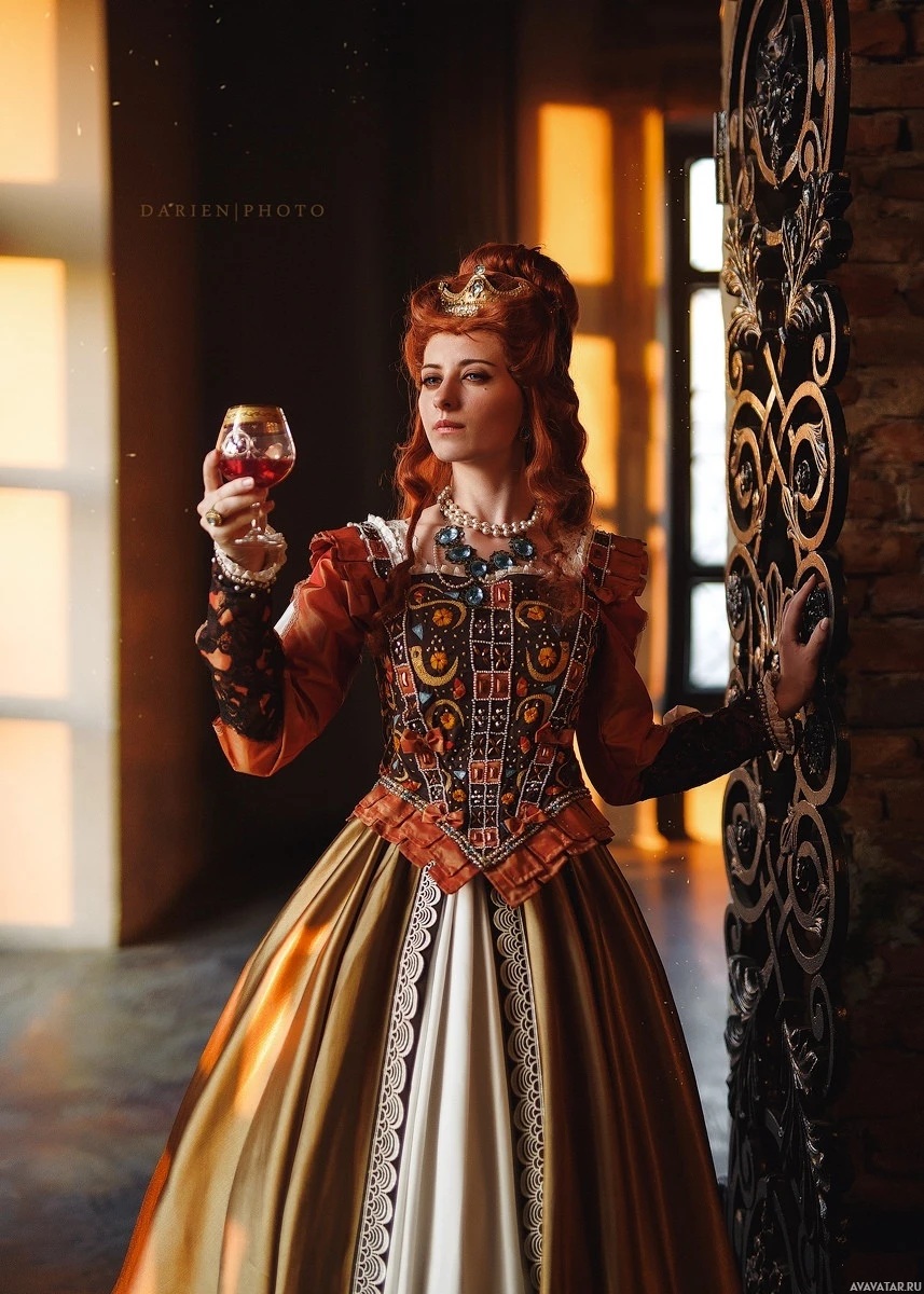 historical attire that resembles the clothing from the Renaissance period. She is holding a glass of red wine and appears to be posing for the photo with