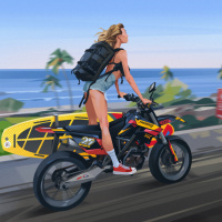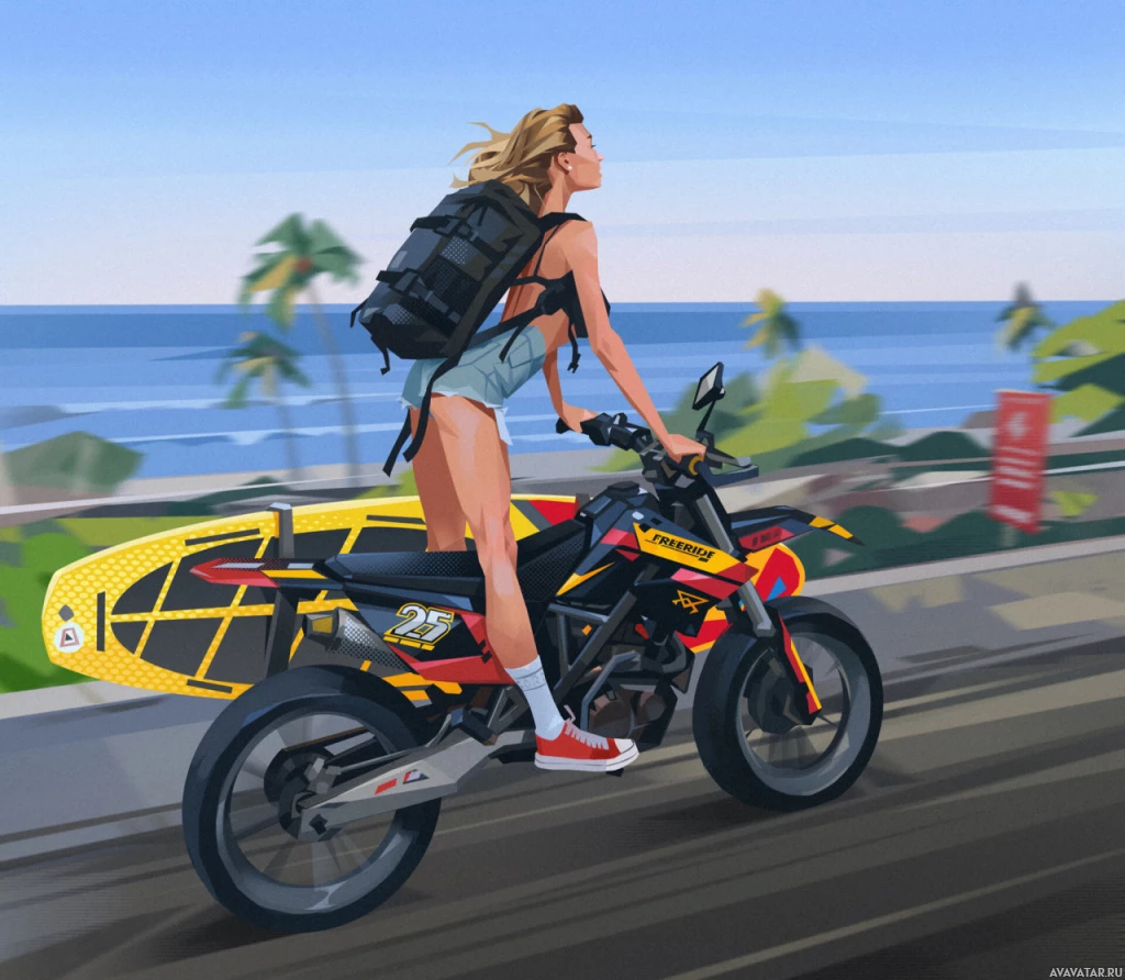a blonde woman from behind, riding a motorcycle. She has a backpack on her back and is wearing shorts suitable for