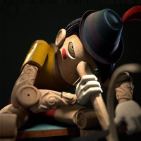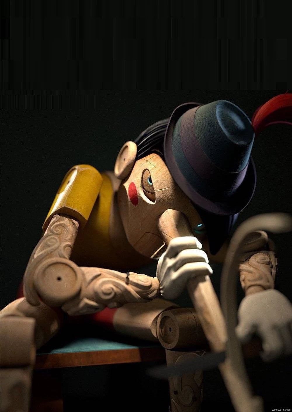 a mechanical doll or puppet, wearing a hat and holding what looks like a string. The background is dark, which contrasts with the lighter colors of the doll's attire, giving it a somewhat eerie or contemplative appearance. The doll has a human-like pose, as if it were resting its chin on its hand in thoughtfulness. The overall vibe suggests it might be from a storytelling or animated