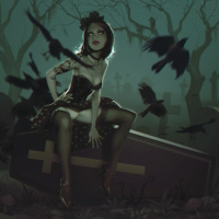 dark hair, wears a black dress with polka dots and ruffles, and sits on top of what appears to be a gravestone or monument with crosses on it. In the background, there is a dark, ominous graveyard setting with trees, tombstones, and