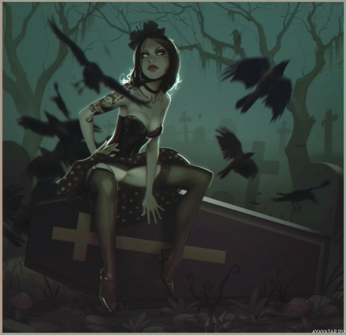 black birds can be seen in flight above her. The overall atmosphere suggests a horror theme, possibly influenced by vampire folklore or gothic aesthetics.
