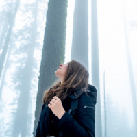The image features a young woman standing in a forest with tall, slender trees that appear to be sequoia or redwood trees. The sky is overcast and the lighting suggests either early morning or late afternoon due to the soft lighting and fog. There's a misty or foggy atmosphere surrounding the trees, which adds a serene and mystical quality to the scene. This could potentially be a location known for its natural beauty and tranquility.