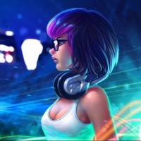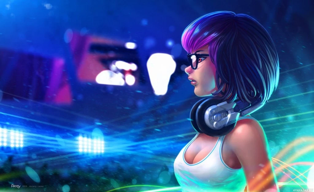 a nighttime setting, possibly at a club or music event given the neon lights and stage in the background. The character is looking off into the distance, suggesting she might be listening to something through her headphones or observing the environment around her.
