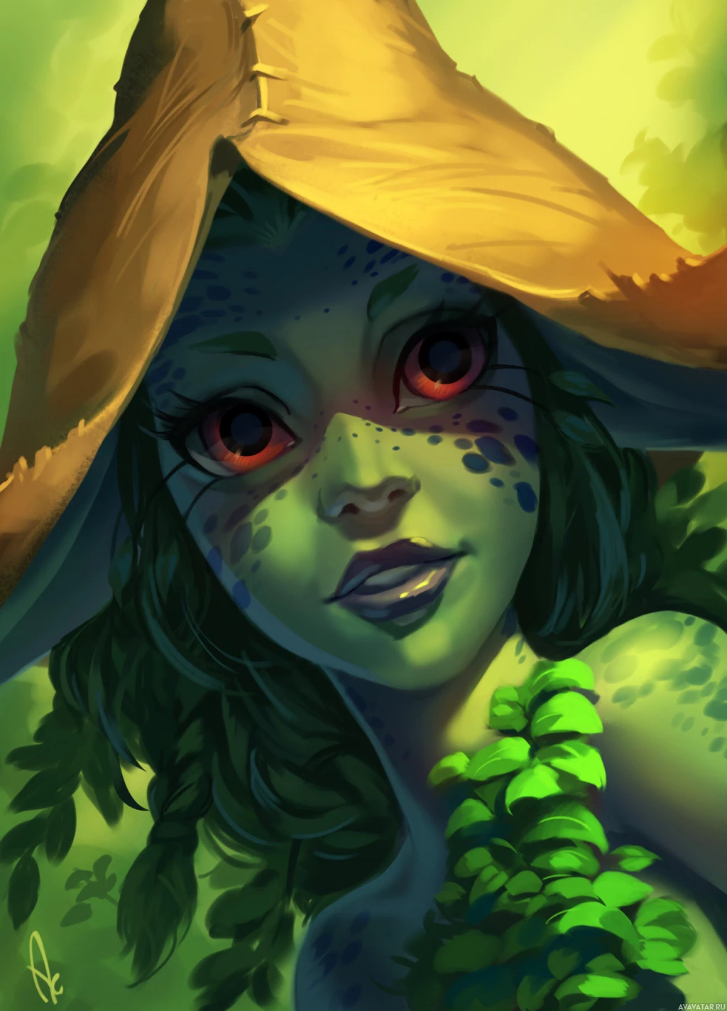 a green vine or plant adorning the character's neck. The character is also wearing a hat that seems to be made from