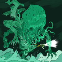 a fantastical scene with an octopus-like creature emerging from the ocean. This creature is typically associated with Cthulhu, which is