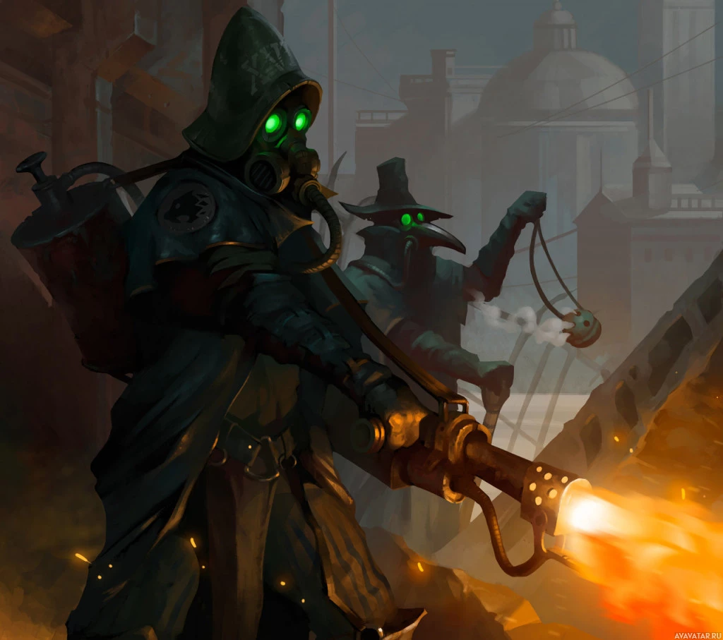 urban scene with an individual wearing a hood and using a flamethrower to set fire to debris on the ground. This character is also equipped with
