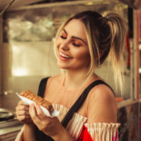 a joyful expression as she takes a bite of her snack, indicating that she's enjoying herself and the food she has purchased.