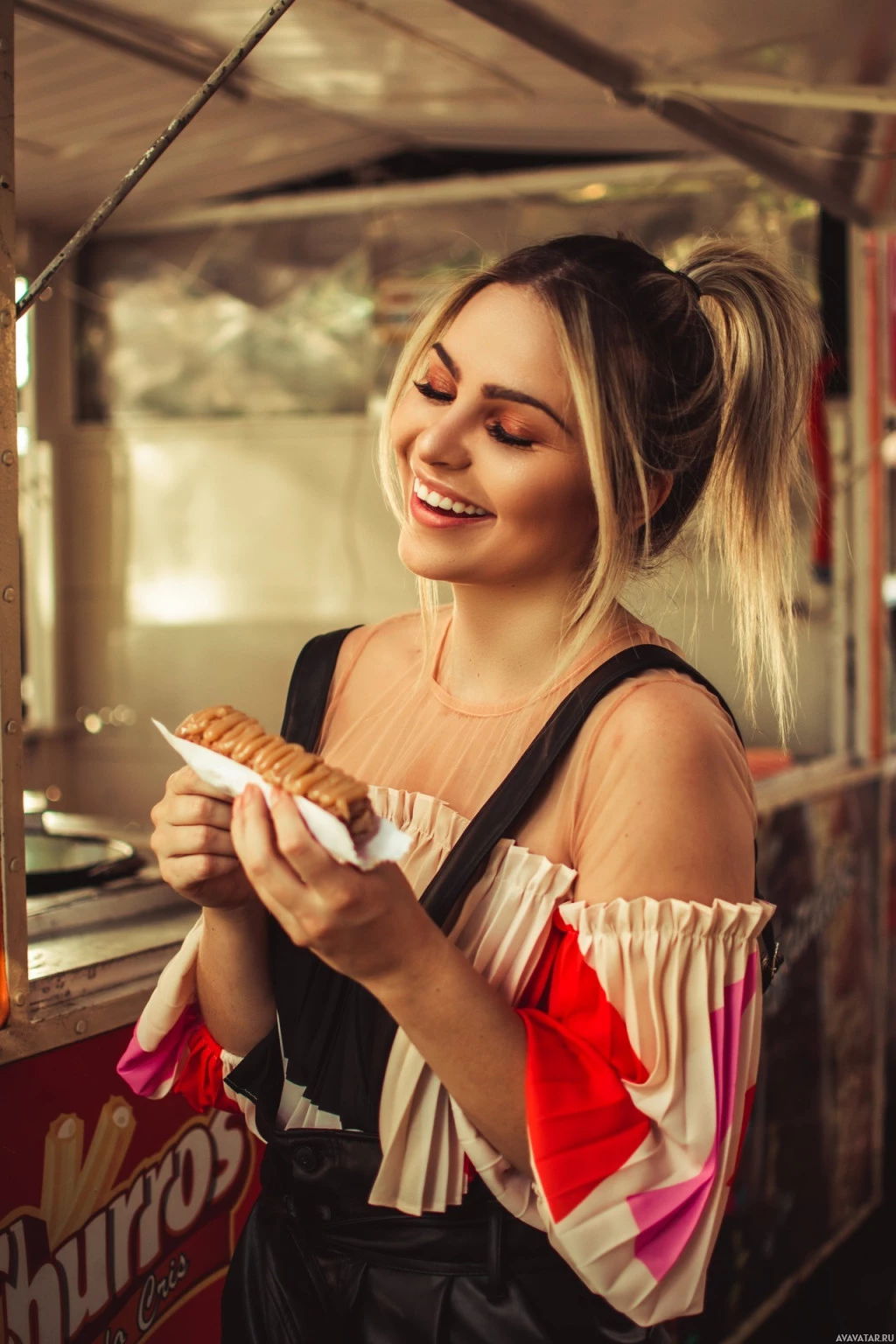 a hot dog. She is standing next to a food cart or truck with the word "Churros" visible on it, suggesting that she might be at a street food stand or