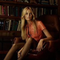 an indoor environment, possibly an office or a study room, indicated by the presence of bookshelves in the background filled with books. Her pose is relaxed yet poised, which might be indicative of a fashion shoot or similar