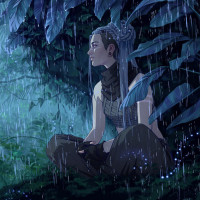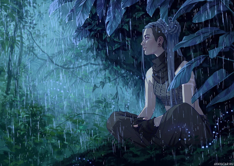 На картинке изображен анимированный персонаж молодой девушки. Она сидит на земле под дождем, глядя в небо с задумчивым выражением. Ее окрестности включают деревья и листву, которые предполагают лесистую местность или джунгли. Невозможно предоставить дополнительную информацию без потенциальной идентификации исходного материала или персонажа из конкретного контекста.