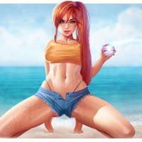 a beach scene with clear skies and ocean waves, which adds to the relaxed atmosphere of the image. The character is not identified as Misty; however, she could be inspired by or resemble characters from various