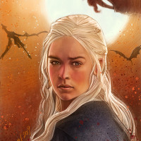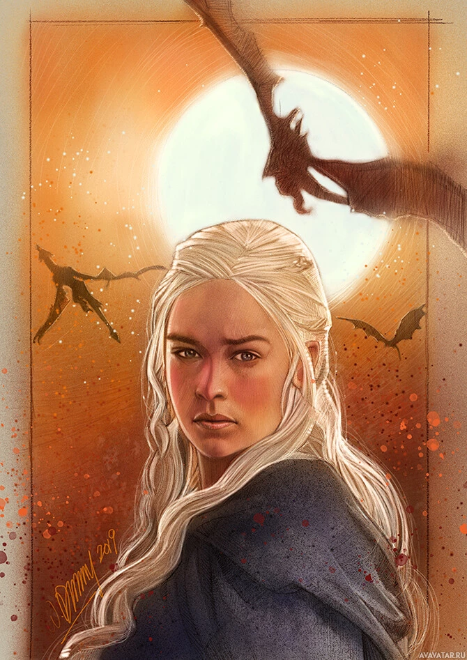 seasons of the show when she is known for her strong leadership and dragon-related storylines. In this illustration, Daenerys is set against