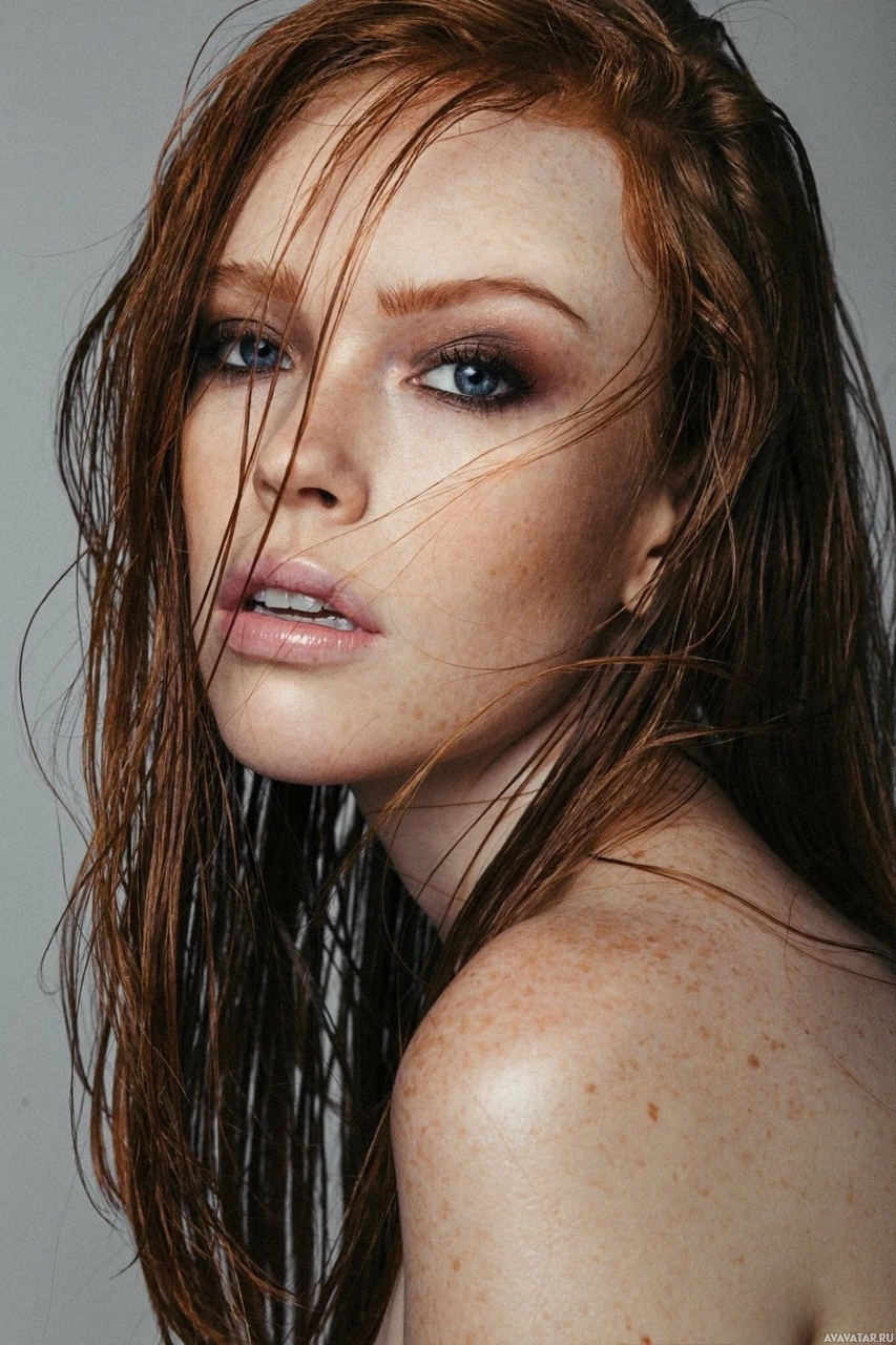 red hair. Her gaze is directed towards the camera, and her expression appears to be one of intrigue or allure. She has her hair styled in such a way that it appears as if it's blowing away from her face, which adds a dynamic element to the photo. The makeup on her face enhances her features, and she is wearing what seems to be a blouse with an off-the-shoulder design, revealing some skin on her shoulders. The overall tone of the image is quite moody and dramatic, suggesting that it could be related to fashion or perhaps a promotional image for a brand or product.