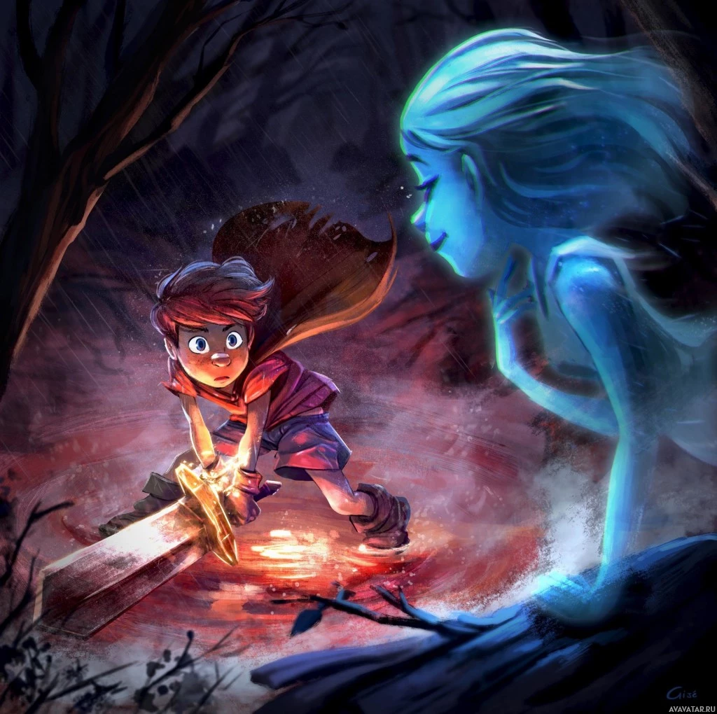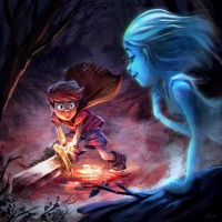 an animated scene with a young boy and a ghost. The boy is holding what appears to be a sword or knife, and he's wearing