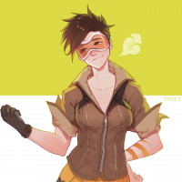 The image depicts an animated character resembling Tracer from