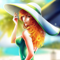 red hair, wearing a light green hat and a matching dress. She is standing outdoors in what appears to be a sunny environment, possibly near a beach or pool area, given the presence of