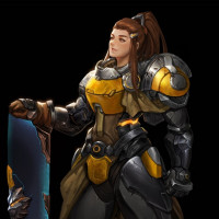 На картинке изображен анимированный персонаж из видеоигры Overwatch. Бригитта известна своим кибернетическим протезом и способностью восстанавливать поврежденные барьеры или щиты в игре. Она изображена с уверенным выражением лица, держа в руках оружие, которое кажется частью ее арсенала.