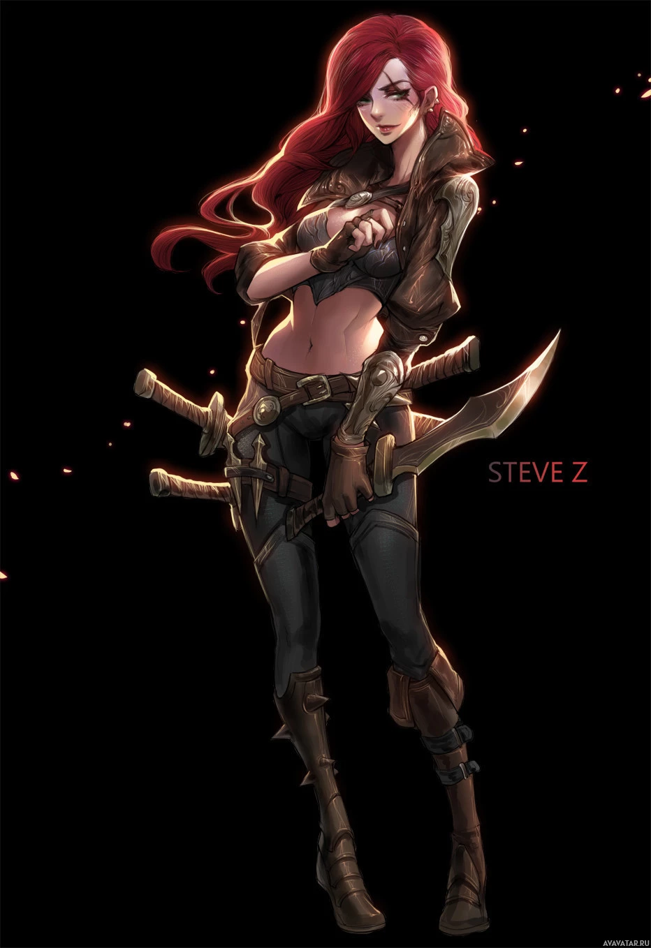 The image depicts an illustrated character who appears to be Katarina, a fictional character from