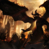 large dragons, one of which appears to be malevolent and attacking the other dragon. Additionally, there are several smaller creatures that resemble demons or monsters, adding to