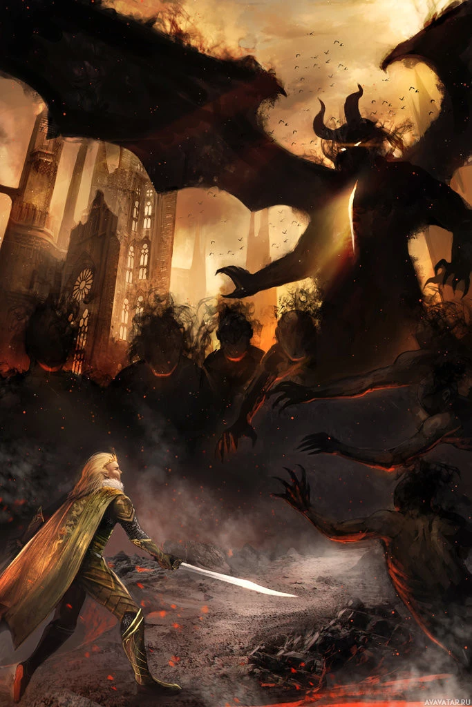 a fantasy scene with various elements that suggest a battle or confrontation. There is