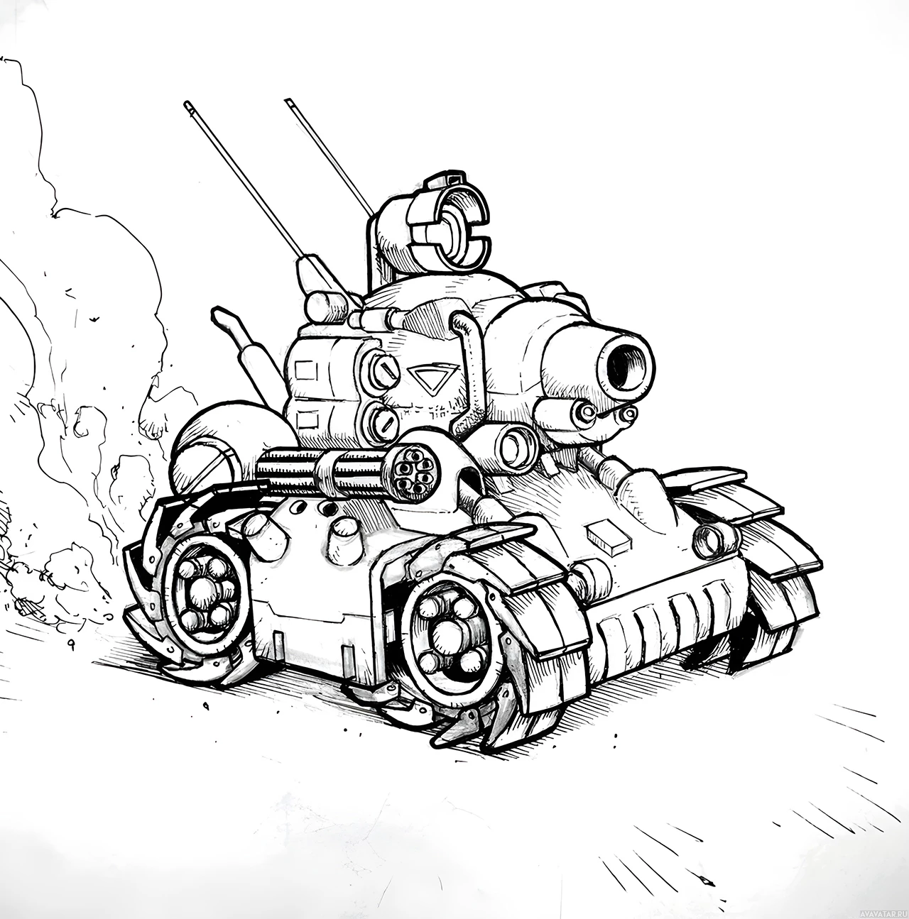 smoke trails behind the tank, indicating movement or the aftermath of firepower usage. It is important to note that this image contains illustrative artwork rather than a photograph of an actual tank in operation.