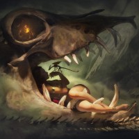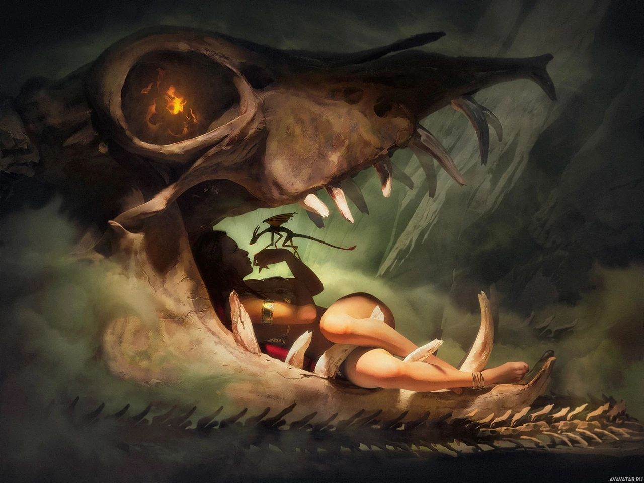 round eyes is lying inside an open skull that functions as a vessel or barge of sorts. The skull is oversized and appears to be floating in water, surrounded by mist. There's