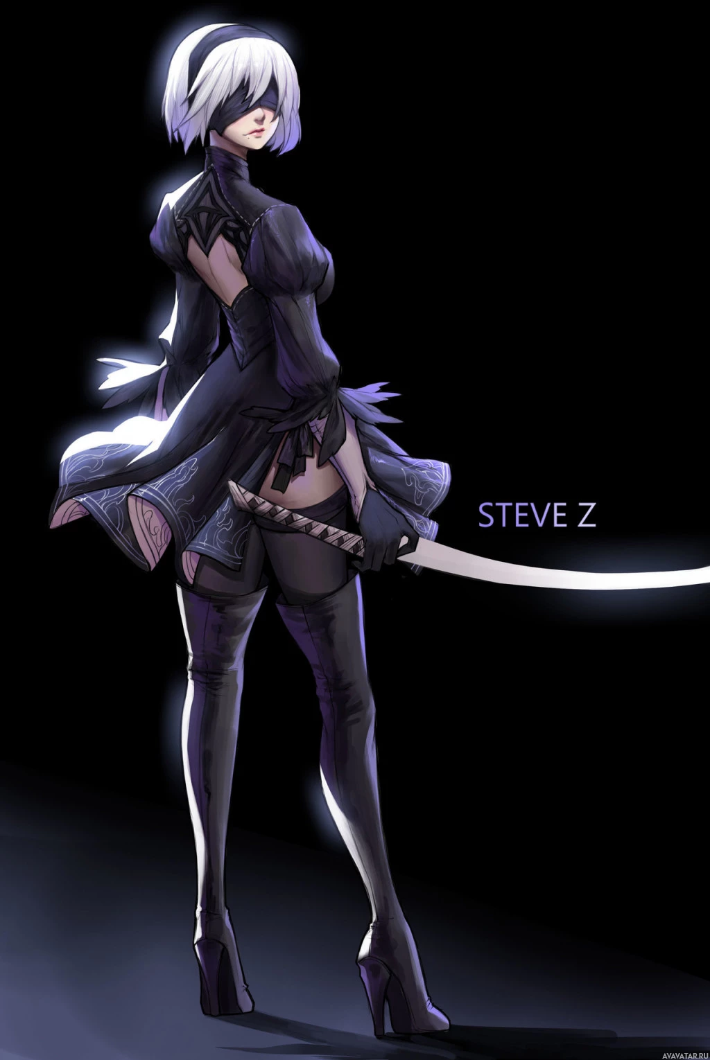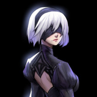female character from the video game "Nier: Automata." She is dressed in a futuristic or armored outfit, which includes elements such as leather and metallic detailing. She appears to be wielding a sword or similar weapon, suggesting she might be part of a combat-
