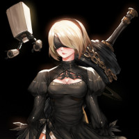 The image features an illustrated character that appears to be inspired by the game "Nier: Automata." She is depicted wearing a black outfit with high boots and holding what looks like a sword. The style of the artwork is detailed and suggests a fantasy or science fiction genre, typical of video games in this vein.