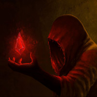 a hooded cloak, holding what appears to be a gem or magical object in their hand. The background has a dark, eerie tone that contributes to
