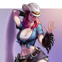 a confident pose and appears to be dressed as a Western or Cowgirl character.