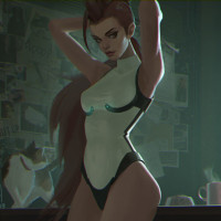 red hair and a confident pose. She is wearing a futuristic-looking outfit that seems to be a tight-