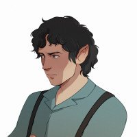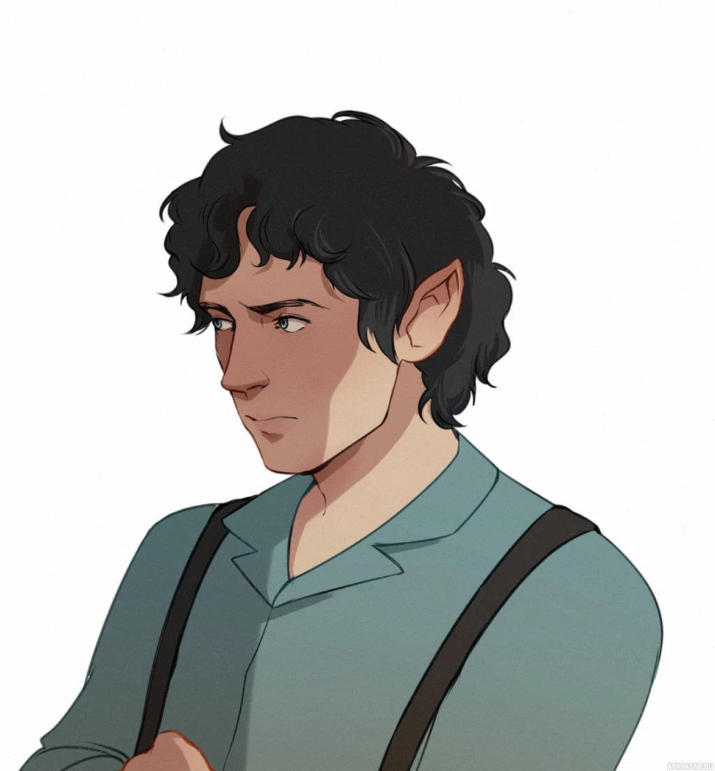 an illustrated character who appears to be Frodo Baggins, a hobbit from the fictional universe of Middle-earth. He is depicted with human-like features, such as