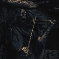The image features a person playing a violin, and the person's face appears to be that of a skeleton. This creates an artistic or eerie effect, as one might not expect to see a violin being played by