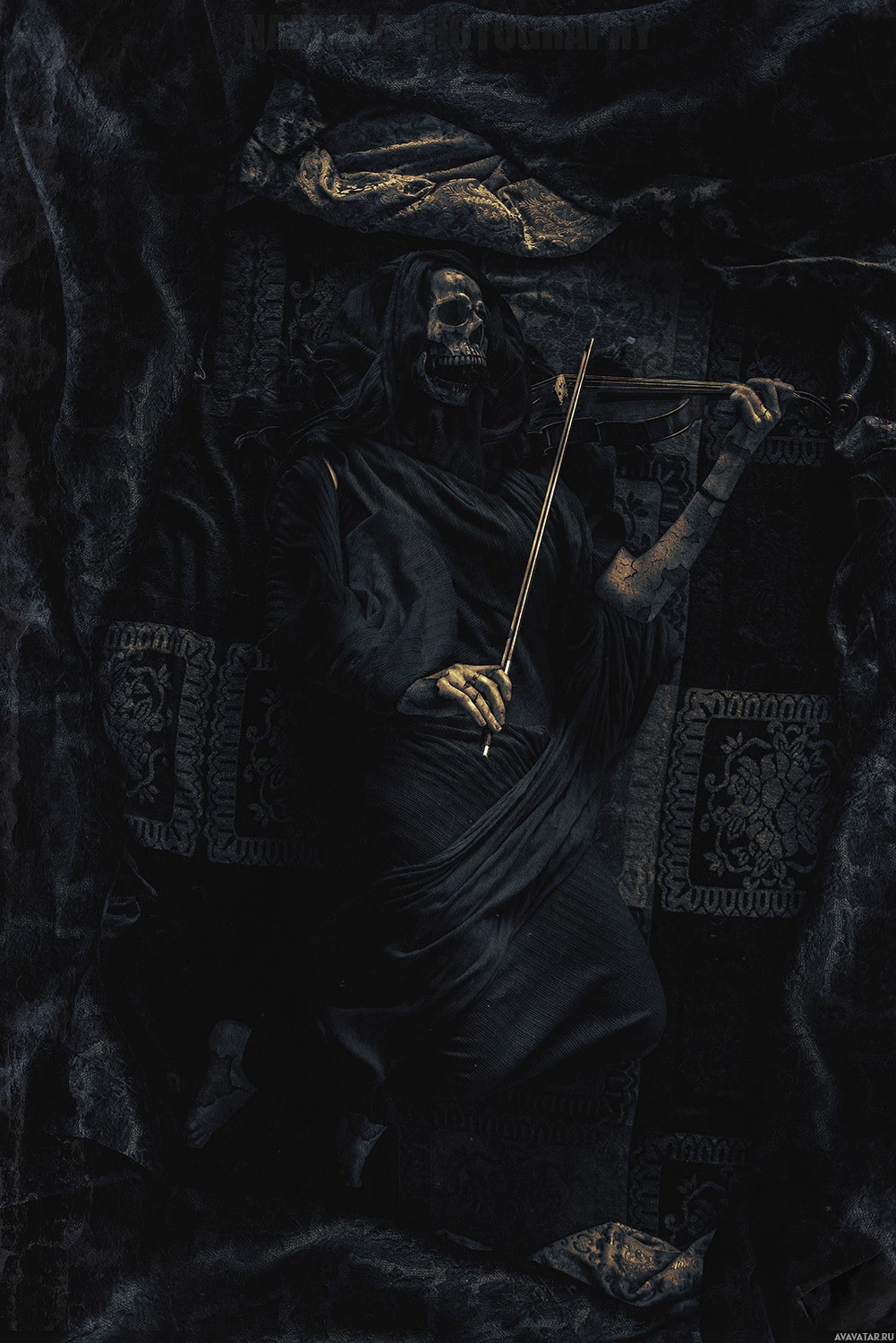 a skeletal figure. The background is dark, with what seems like textured elements, possibly representing a draped fabric or