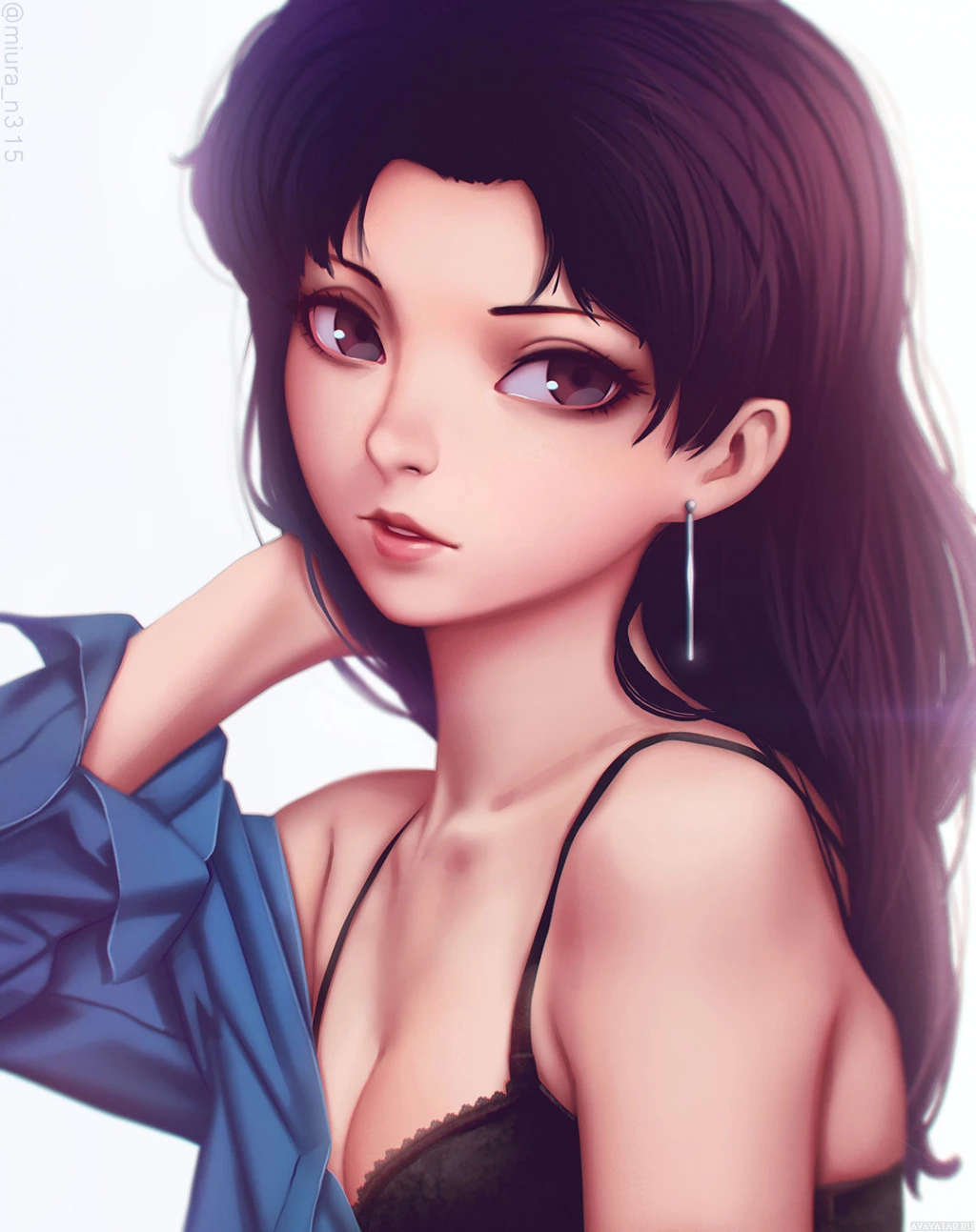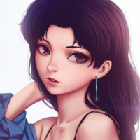 На картинке изображен анимированный персонаж, девушка с длинными темными волосами и фиолетовыми глазами. Она носит черный верх и, кажется, находится в созерцательной или задумчивой позе, с рукой на подбородке. Искусство имеет мягкую цветовую палитру, которая придает ему несколько эфирное ощущение.