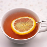 The image shows a cup of tea with a slice of lemon floating on top. There's steam rising from the hot beverage, and the background appears to be a tabletop with a floral pattern, suggesting this might be taken in a dining or kitchen setting.