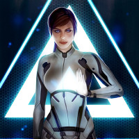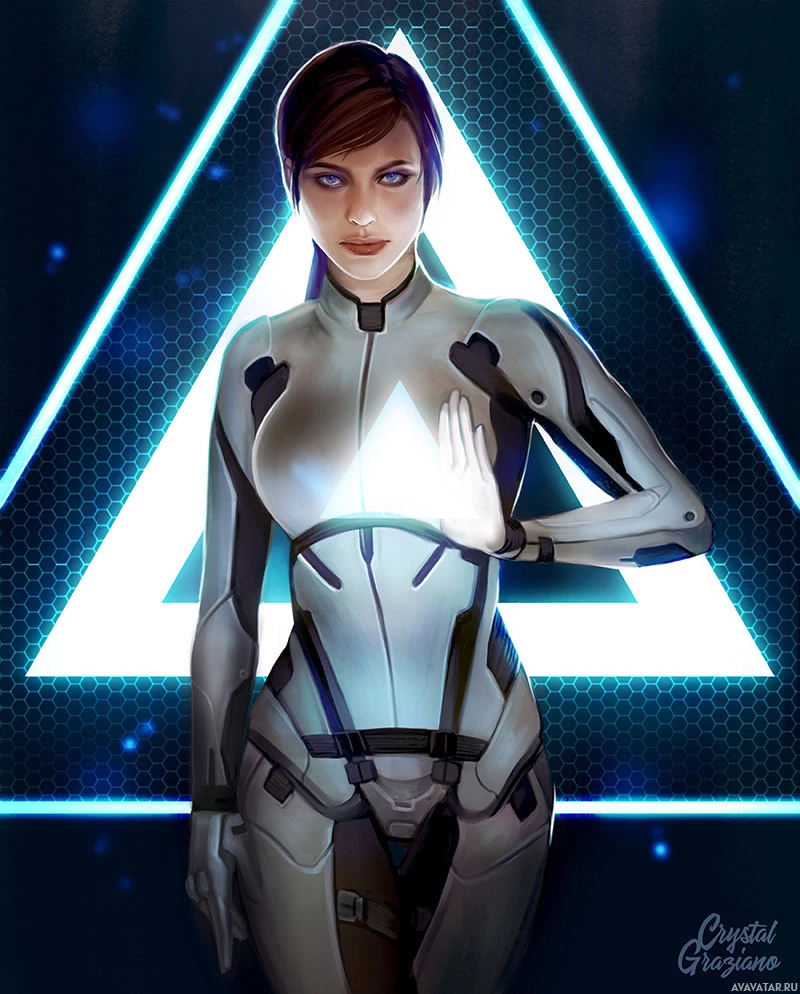 futuristic armor with a prominent emblem on her chest that resembles the Mass Effect logo. She has