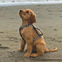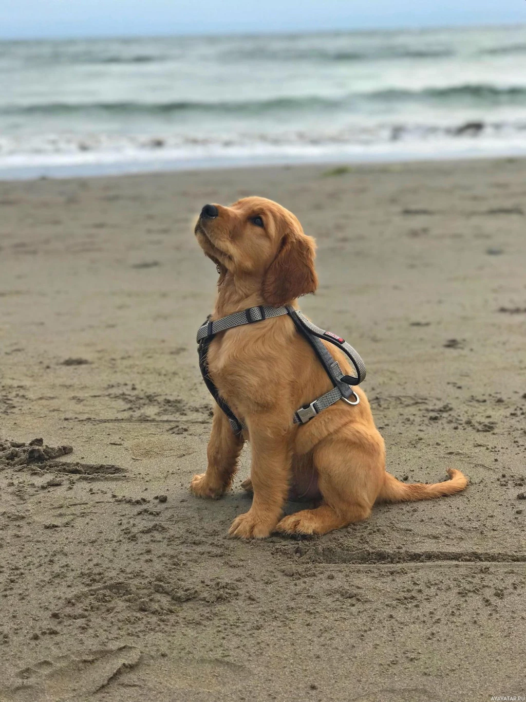 На снимке изображен золотой ретривер, сидящий на песке на пляже. Собака носит поводок или упряжку, которая, по-видимому, предназначена для действий на водной основе, что предполагает, что она может быть служебным животным или использоваться для спасательных работ. Есть также небольшие буи, прикрепленные к поводку, вероятно, указывающие на плавающее устройство, чтобы помочь собаке плавать. Расположение, кажется, на краю моря, где волны встречаются с берегом.
