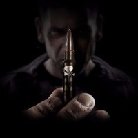 The image features a man holding a bullet casing with his fingers, which is iconic to the character known as Punisher. He appears intense and focused, which aligns with