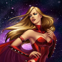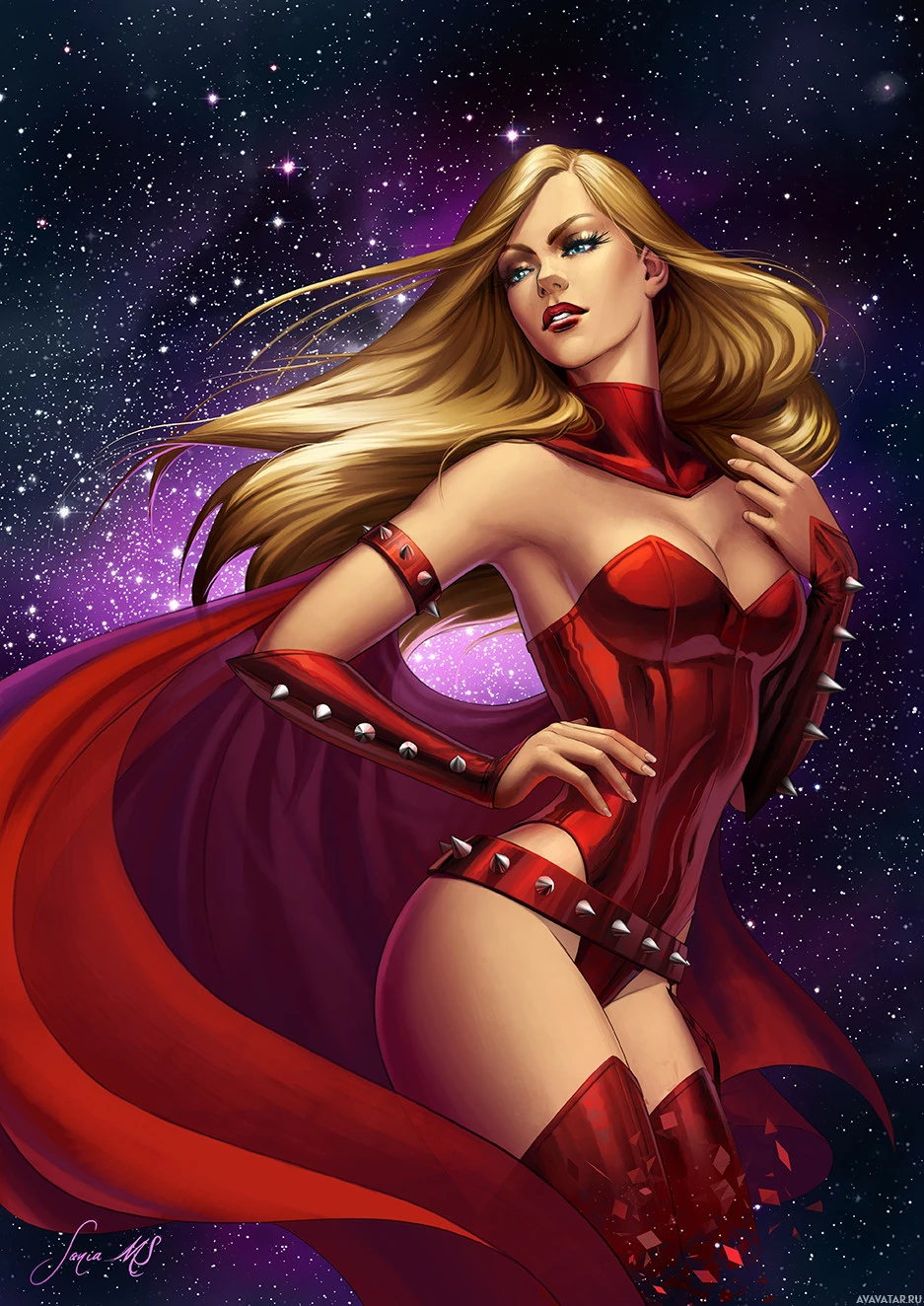 long hair. She is wearing a red and black costume with elements that resemble armor or battle gear. Her attire suggests she might be a warrior or a superheroine. The background features stars and the cosmos, indicating that the setting may be space-themed.